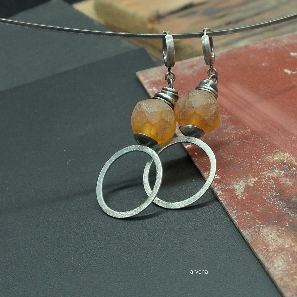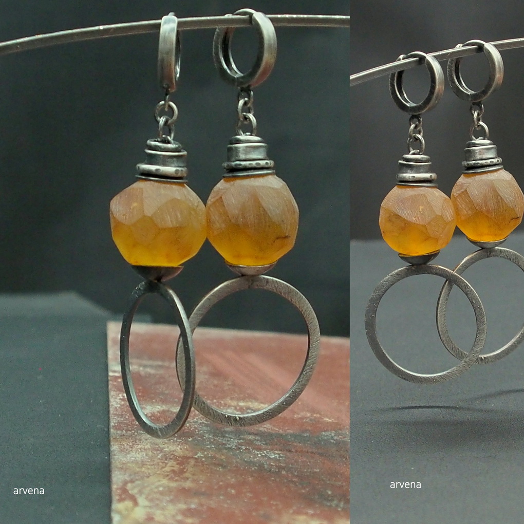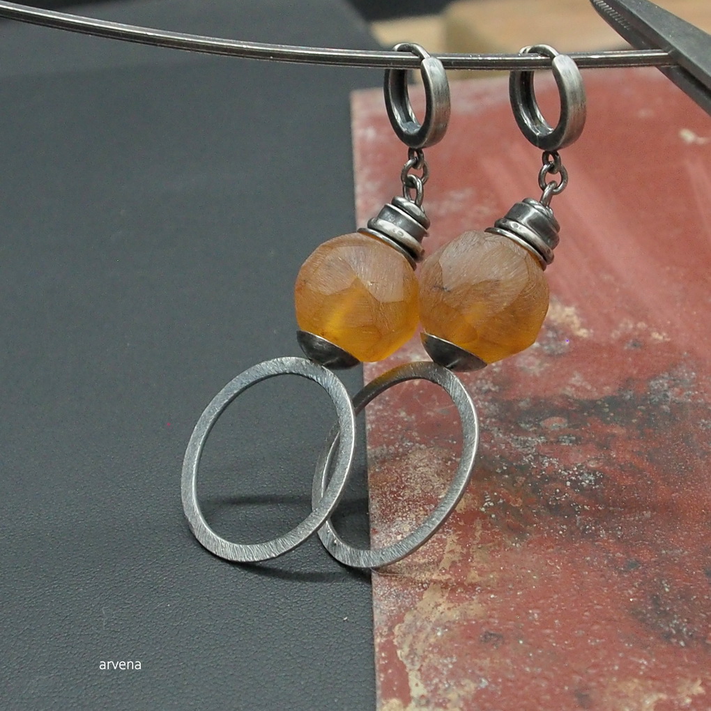 Kolczyki wykonane w 100% z oksydowanego srebra pr. 925 , koła śr. 2,4 cm oraz bursztynów bałtyckich ręcznie formowanych śr. - 1,5 cm; Długość całkowita - 6,4 cm Waga jednego kolczyka 4,8 g.