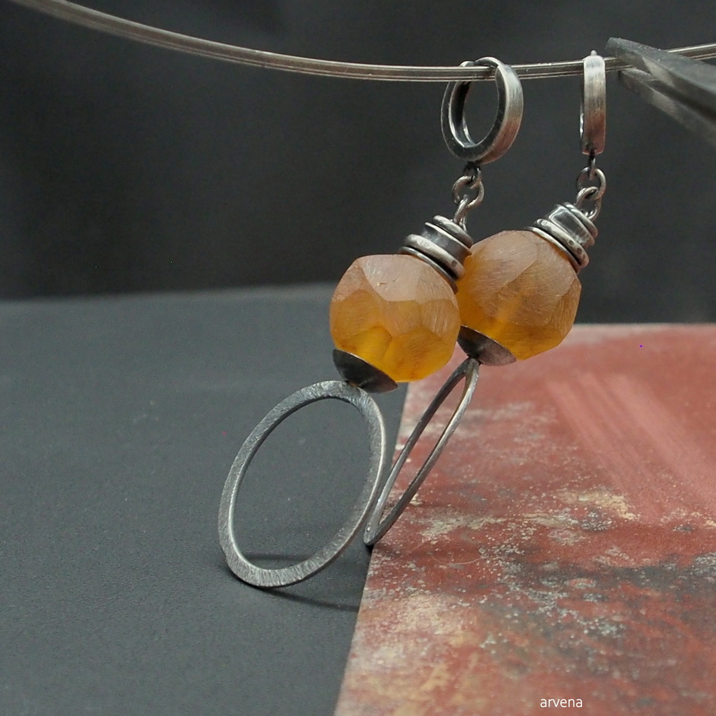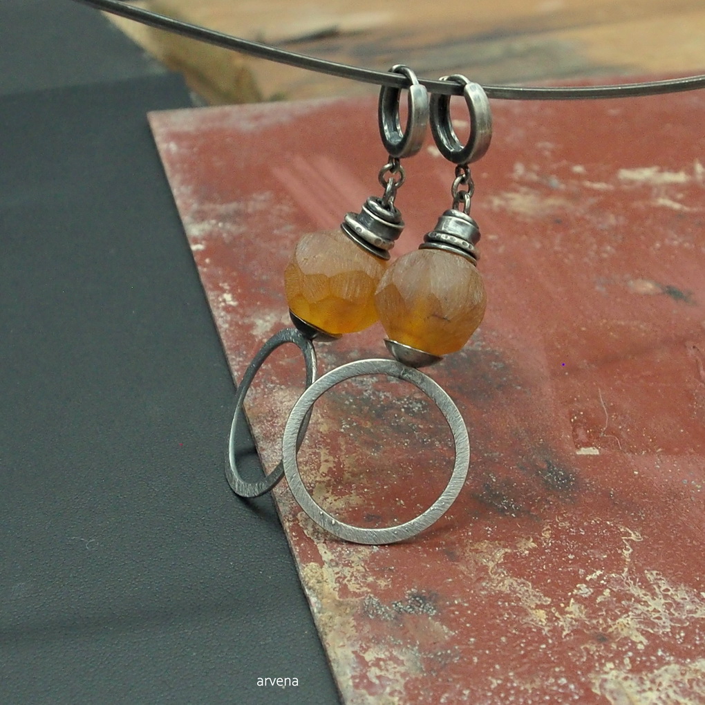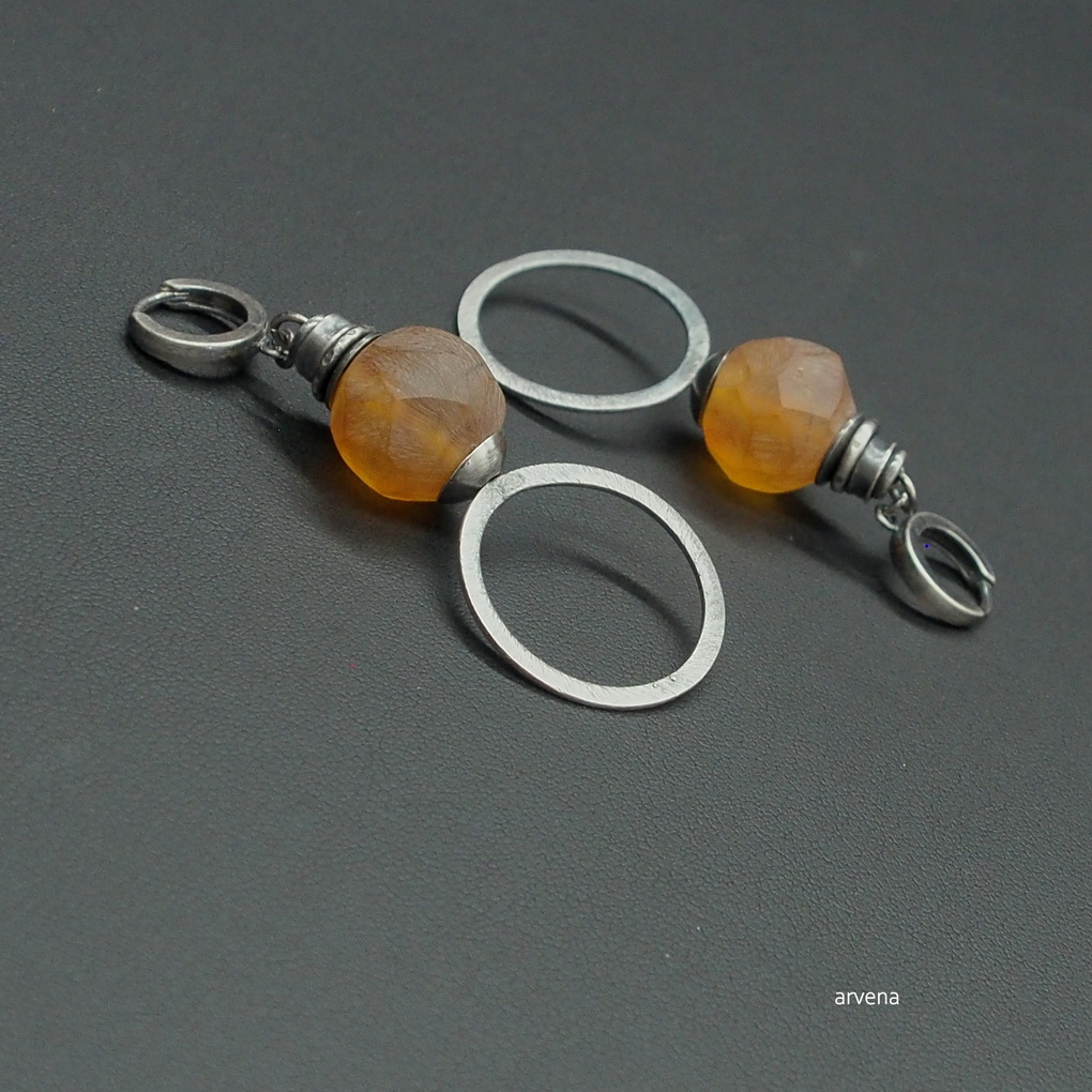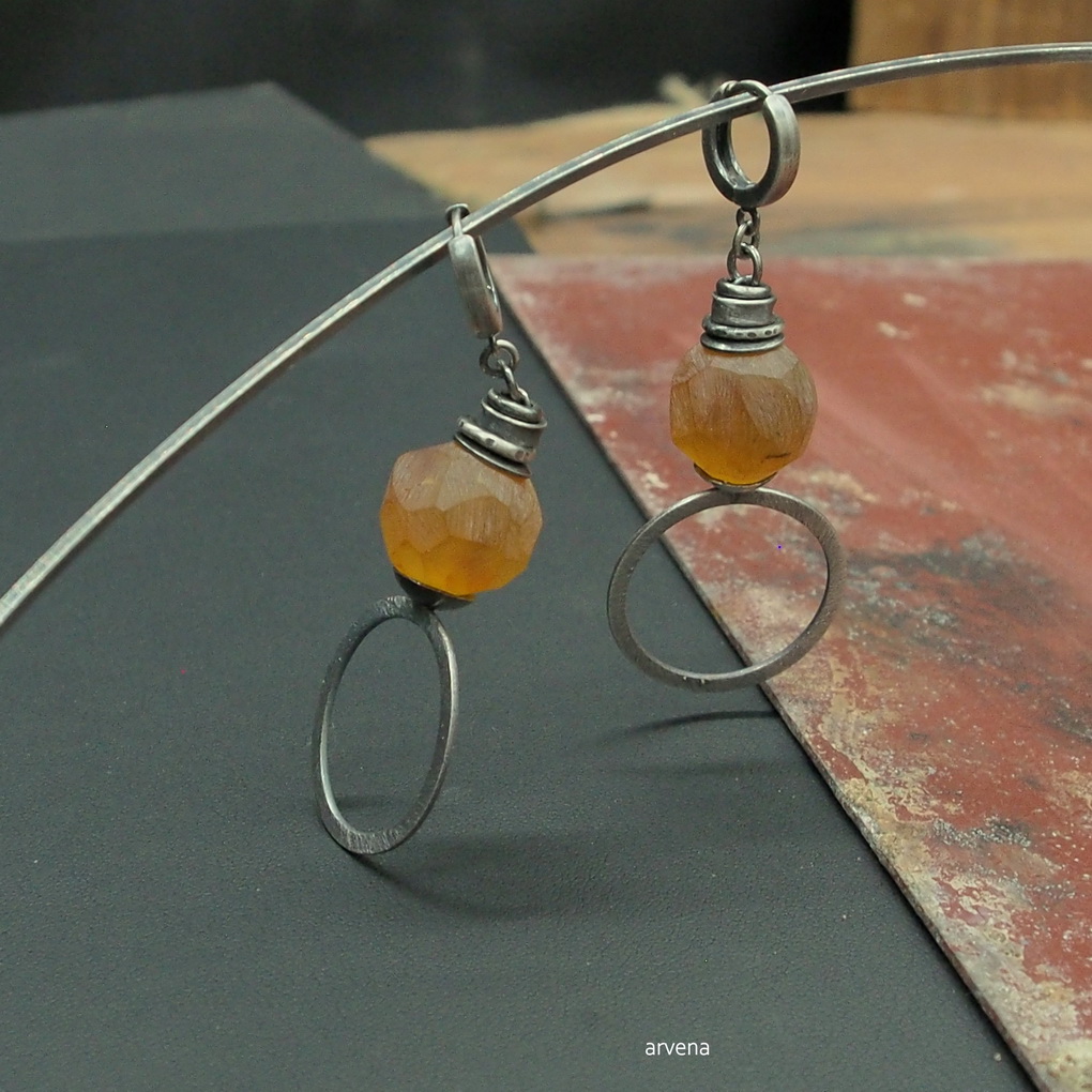 Kolczyki wykonane w 100% z oksydowanego srebra pr. 925 , koła śr. 2,4 cm oraz bursztynów bałtyckich ręcznie formowanych śr. - 1,5 cm; Długość całkowita - 6,4 cm Waga jednego kolczyka 4,8 g.