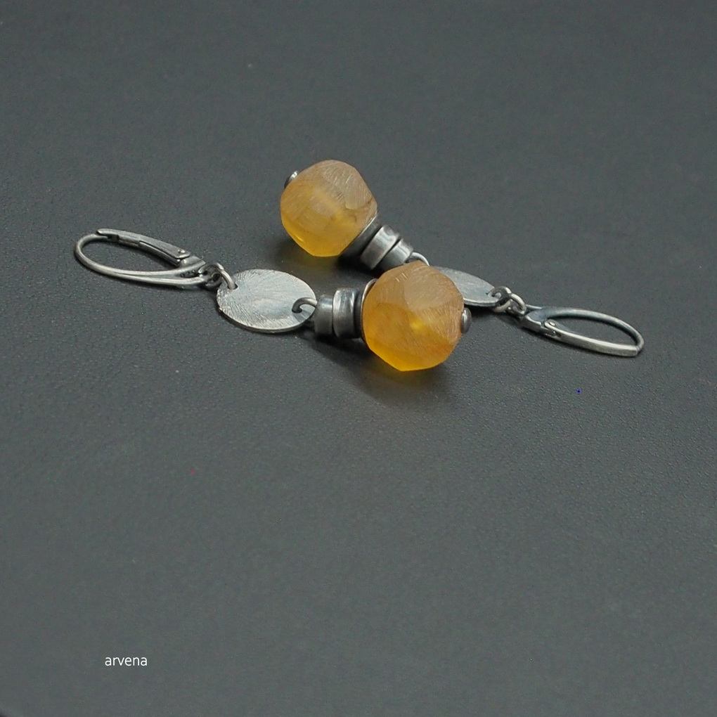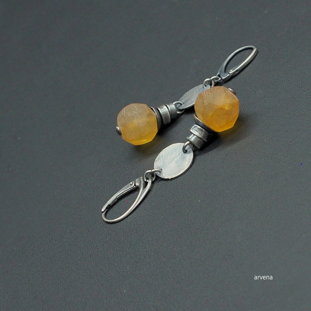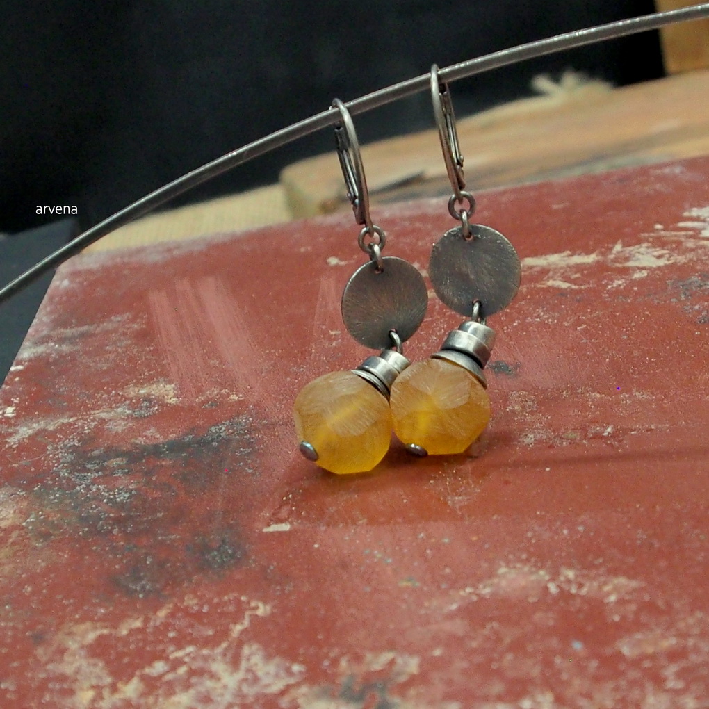 Kolczyki wykonane w 100% z oksydowanego srebra pr. 925 , ręcznie wykonane przekładki i blaszki śr. 1,2 cm, oraz bursztynów bałtyckich ręcznie formowanych śr. ok. 1,3 cm; Długość całkowita 5,3 cm Waga jednego kolczyka 3,2 g.
