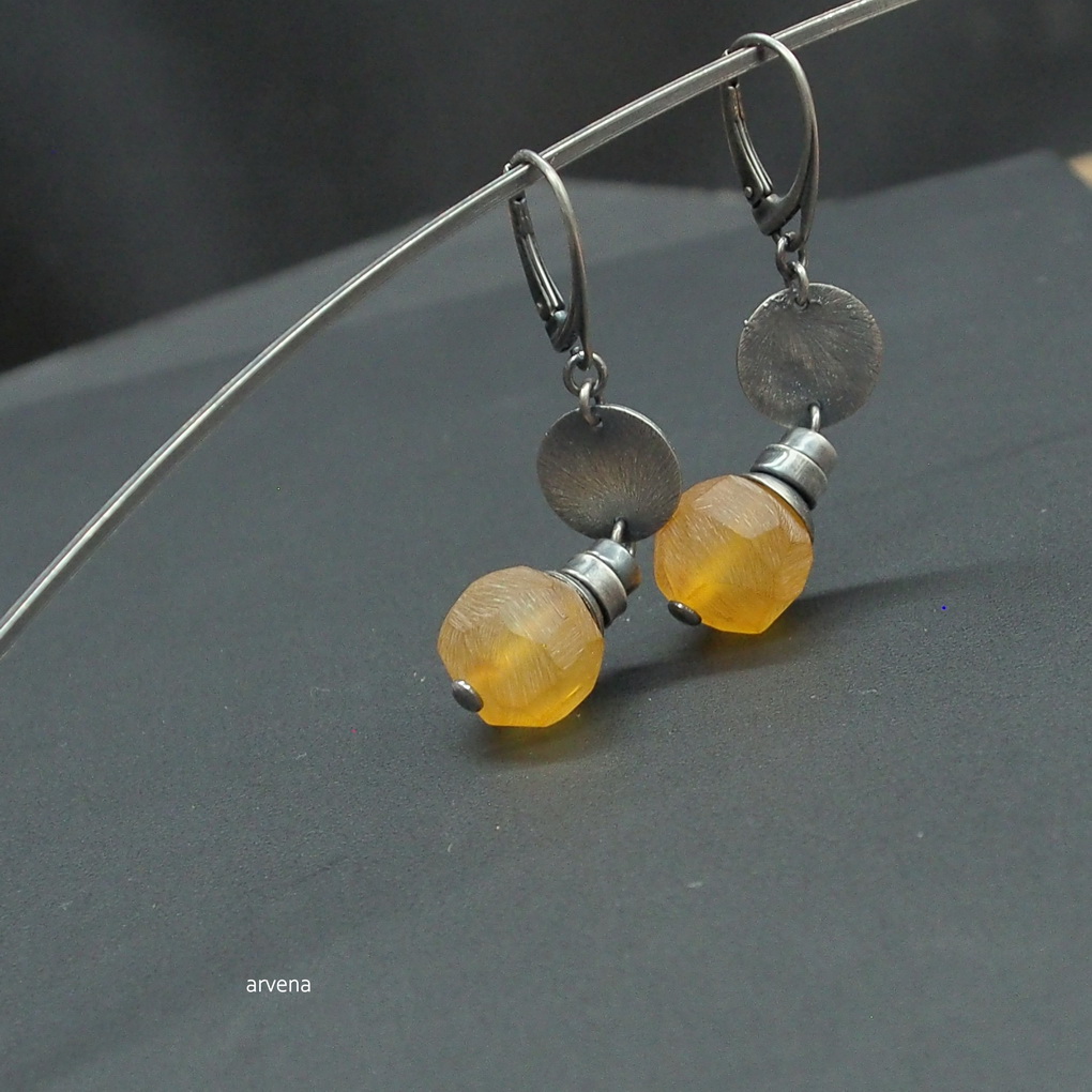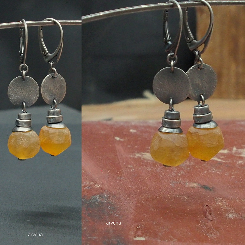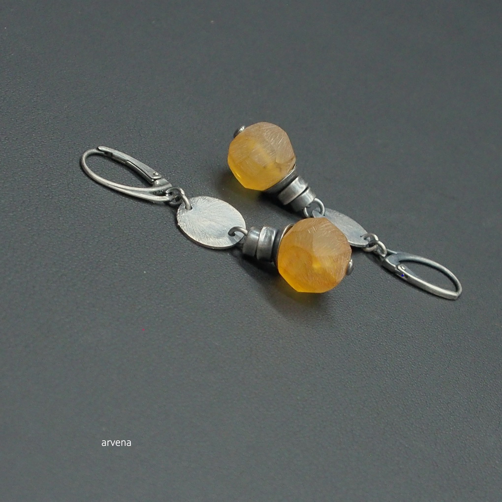 Kolczyki wykonane w 100% z oksydowanego srebra pr. 925 , ręcznie wykonane przekładki i blaszki śr. 1,2 cm, oraz bursztynów bałtyckich ręcznie formowanych śr. ok. 1,3 cm; Długość całkowita 5,3 cm Waga jednego kolczyka 3,2 g.