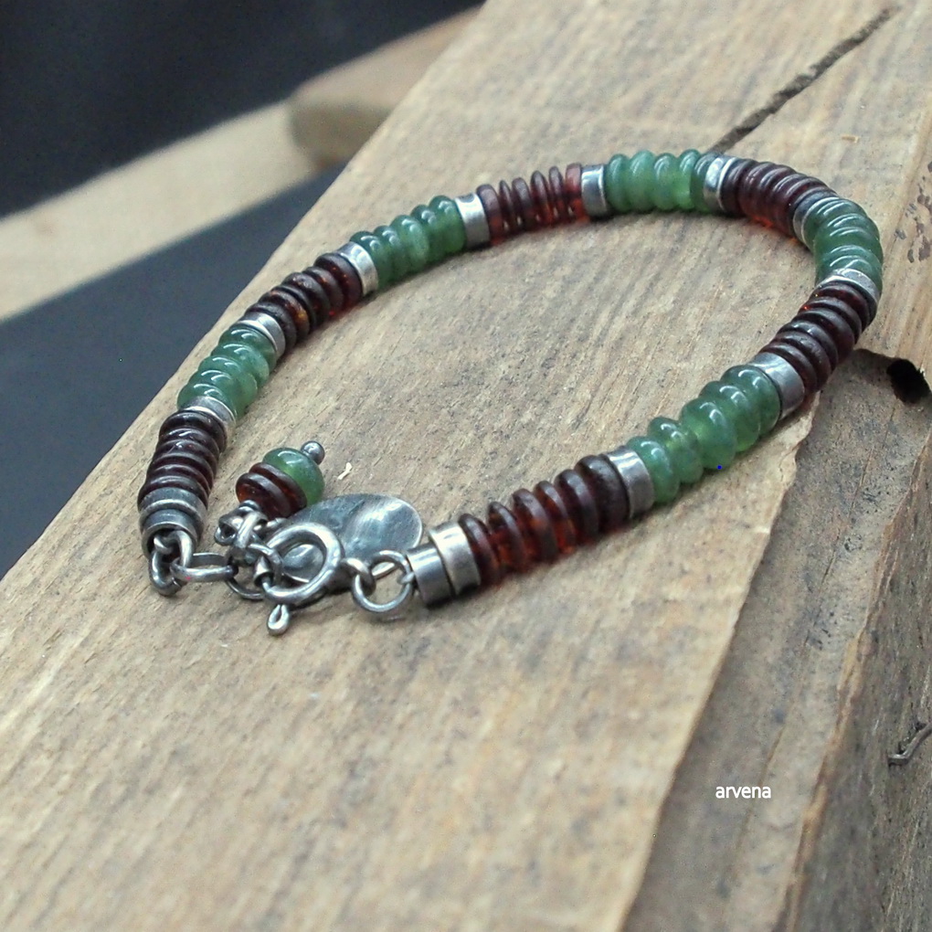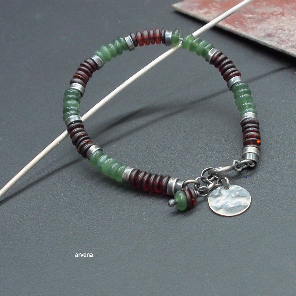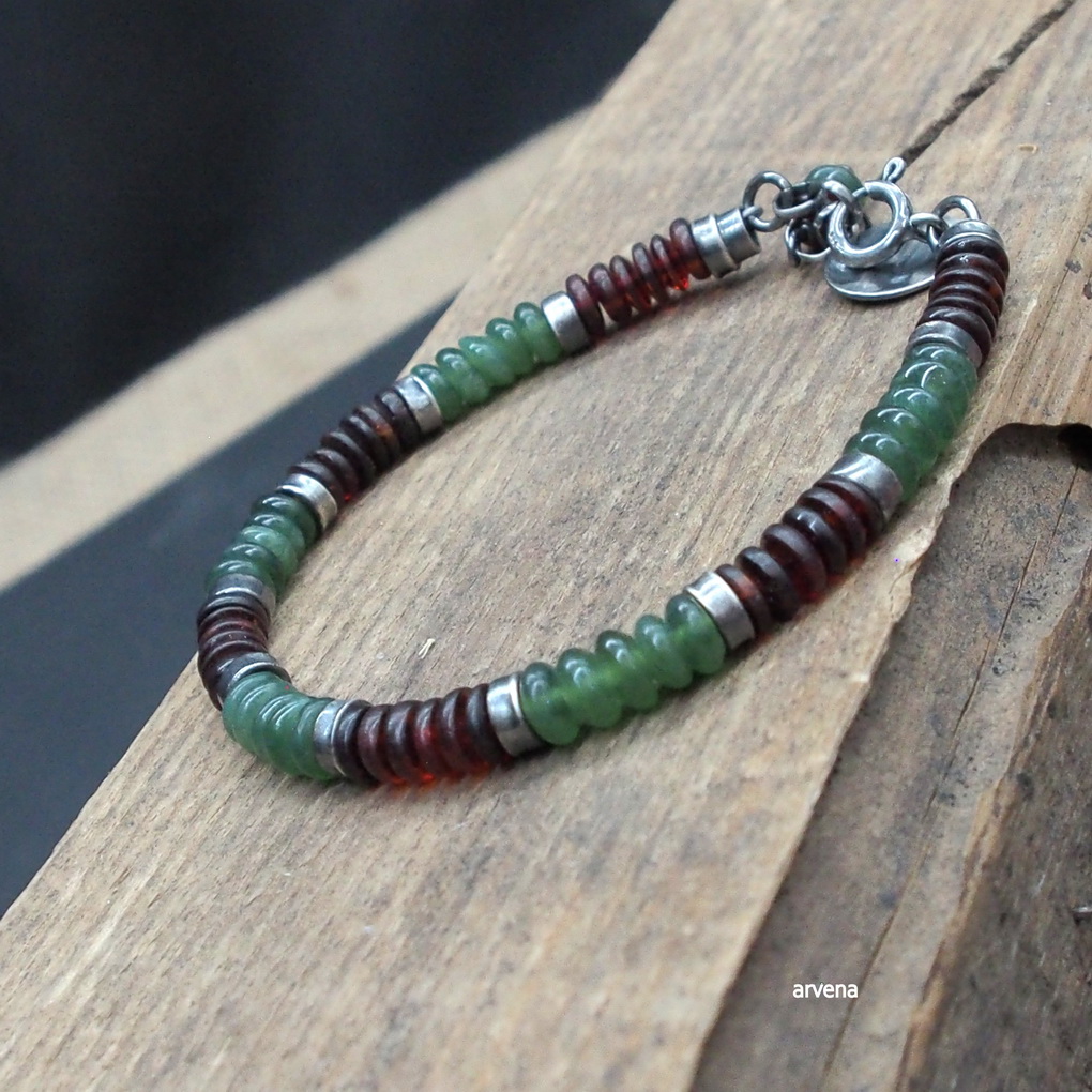 Bransoletka wykonana w 100 % ze srebra oksydowanego pr. 925, oraz naturalnych kamieni: polerowane talarki nefrytu, matowione talarki bursztynu śr. 5,0 - 5,5 mm