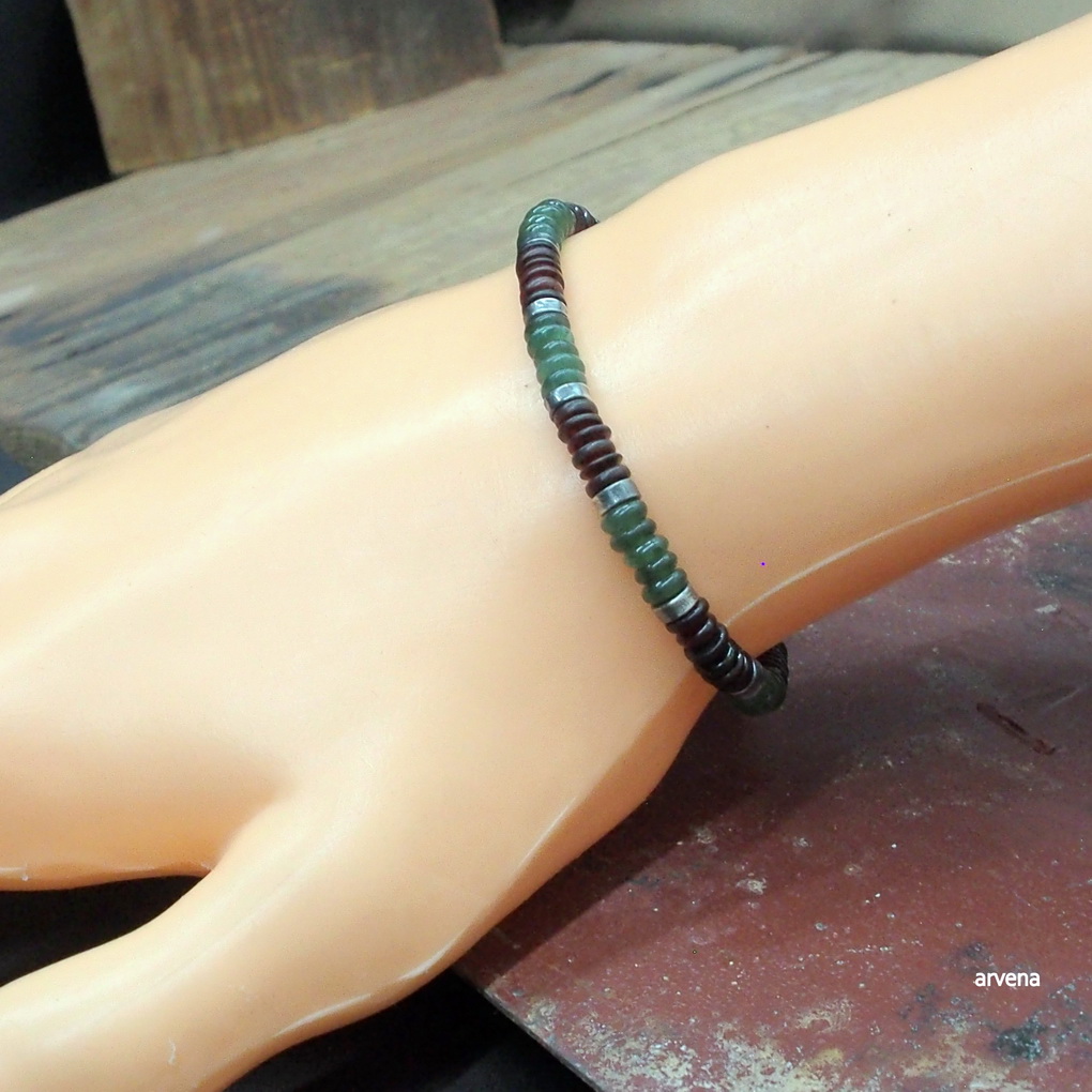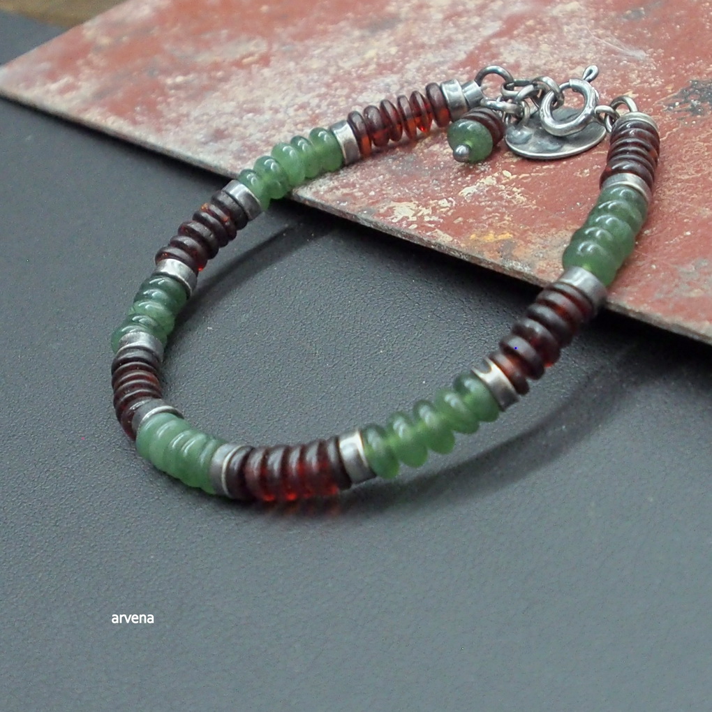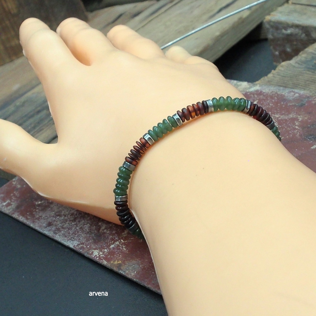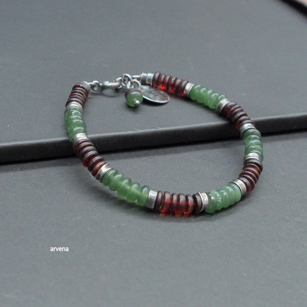 Bransoletka wykonana w 100 % ze srebra oksydowanego pr. 925, oraz naturalnych kamieni: polerowane talarki nefrytu, matowione talarki bursztynu śr. 5,0 - 5,5 mm