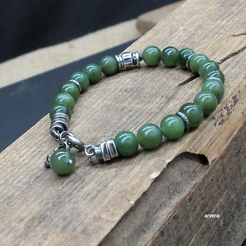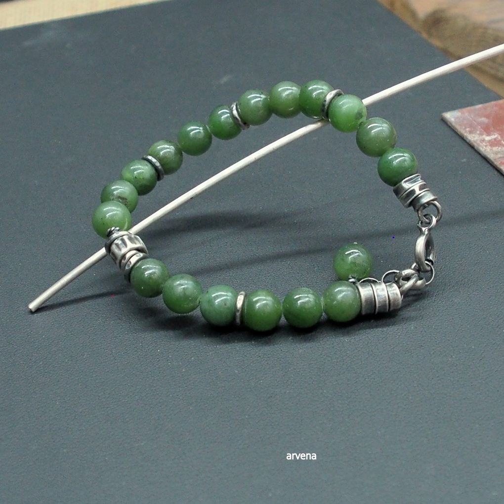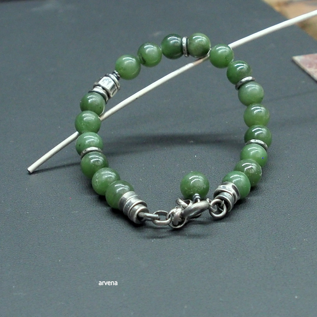 Bransoletka wykonana w 100 % ze srebra oksydowanego pr. 925 oraz z naturalnych kamieni: - nefryt w formie polerowanych kulek śr. 8 mm. Długość bransoletki 21 cm w tym 2,5 cm regulacji/ obwód regulowany 17 - 19,5cm.