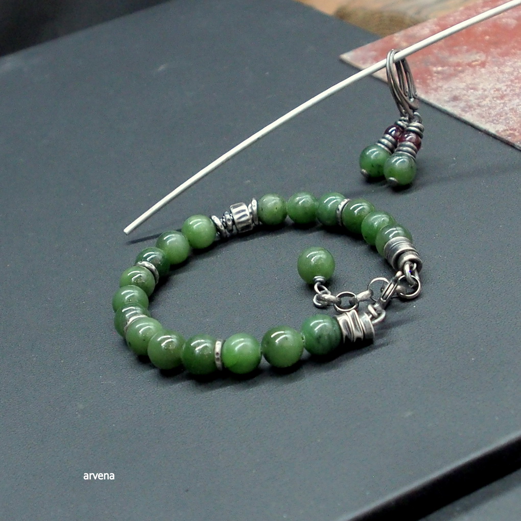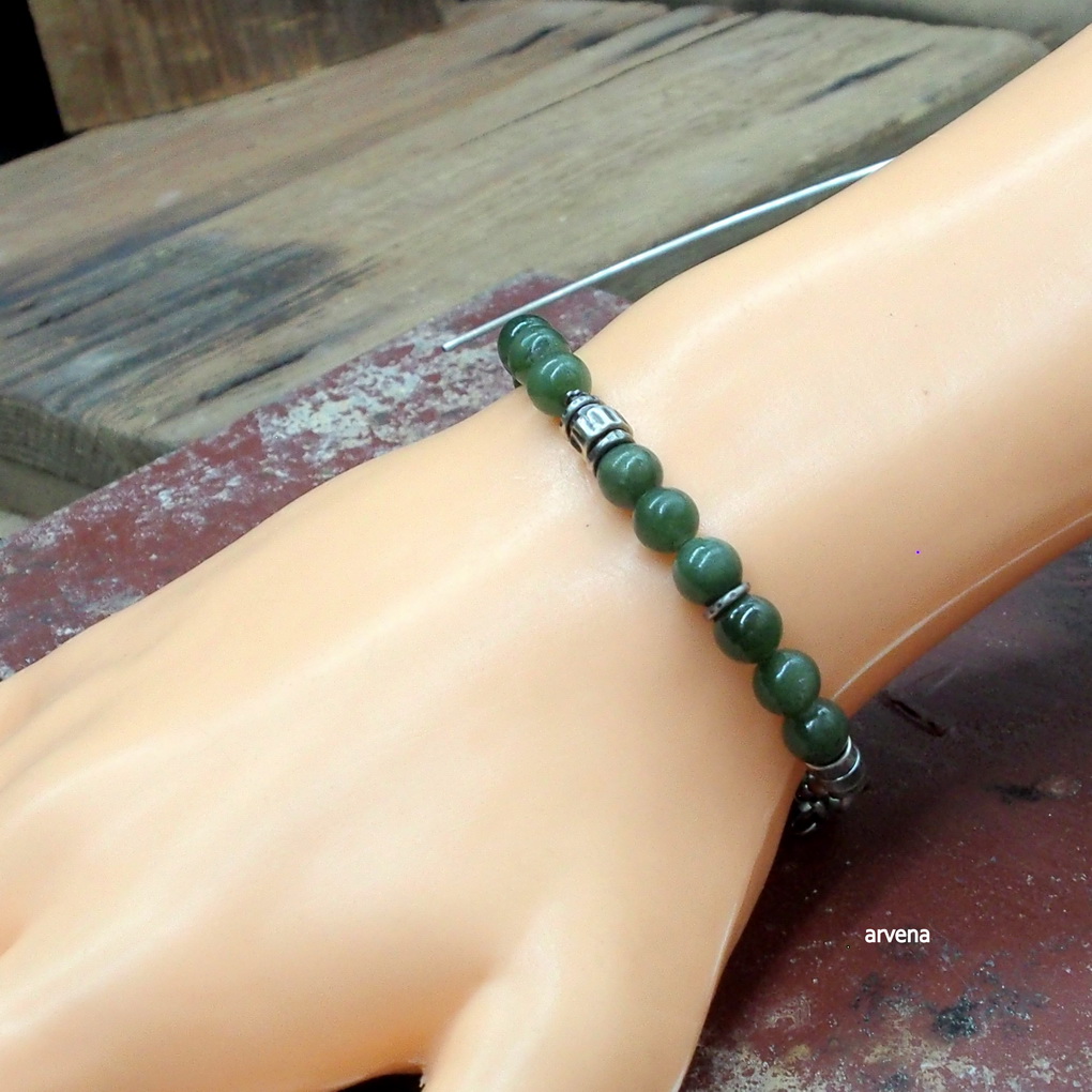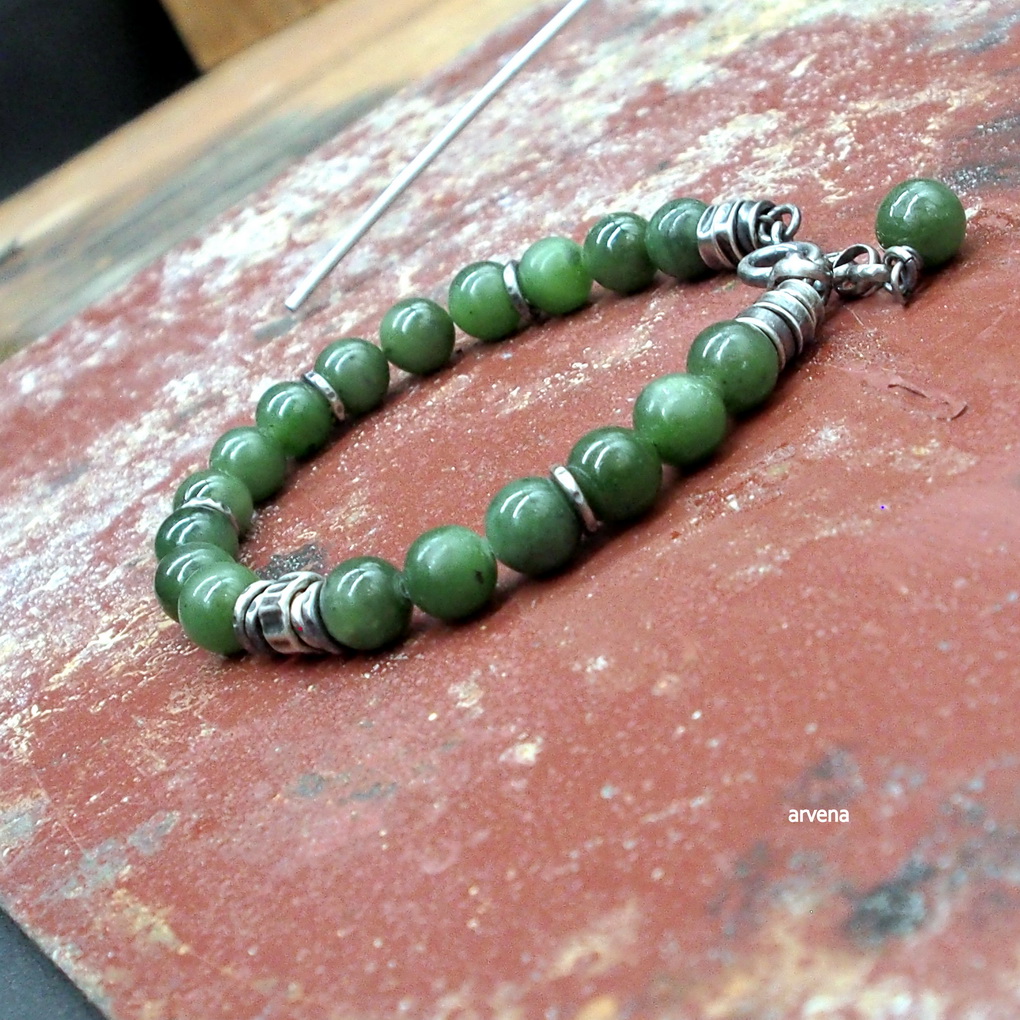 Bransoletka wykonana w 100 % ze srebra oksydowanego pr. 925 oraz z naturalnych kamieni: - nefryt w formie polerowanych kulek śr. 8 mm. Długość bransoletki 21 cm w tym 2,5 cm regulacji/ obwód regulowany 17 - 19,5cm.