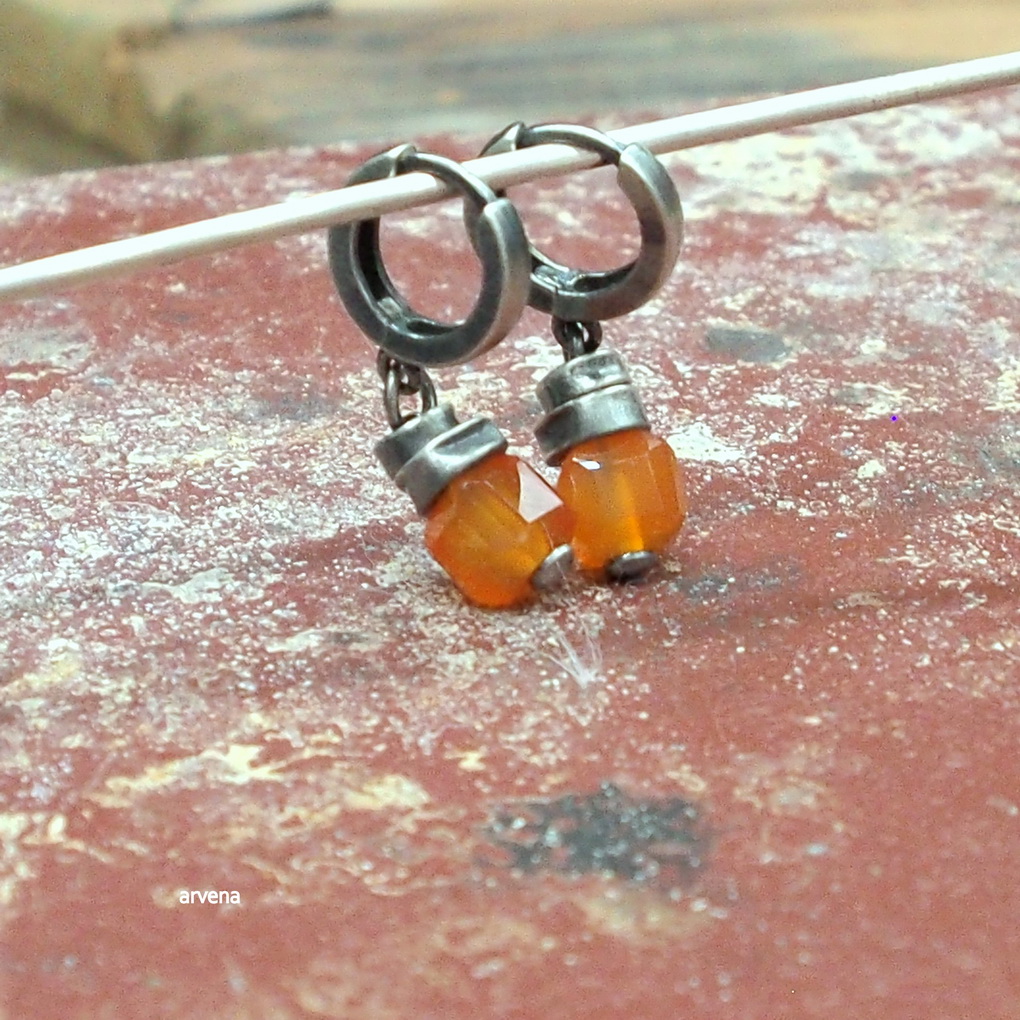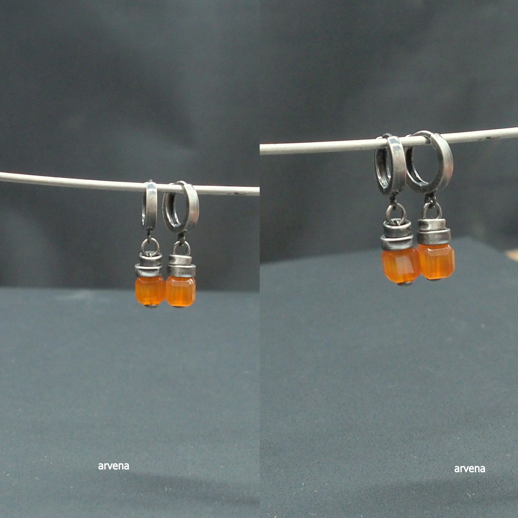 Kolczyki wykonane w 100% z oksydowanego srebra pr. 925 oraz naturalnych kamieni: karneol w formie sześcianu wielkości ok. 0,7 cm. Długość całkowita - 2,8 cm. Waga jednego kolczyka 1,85 g.